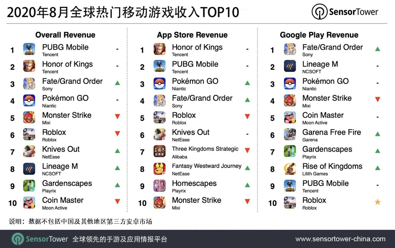 腾讯《王者荣耀》8月收入超过2.04亿美元,同比增长25.5%,位列榜单第二名。中国版本贡献了95%的收入,其次为泰国版本占1.7%。