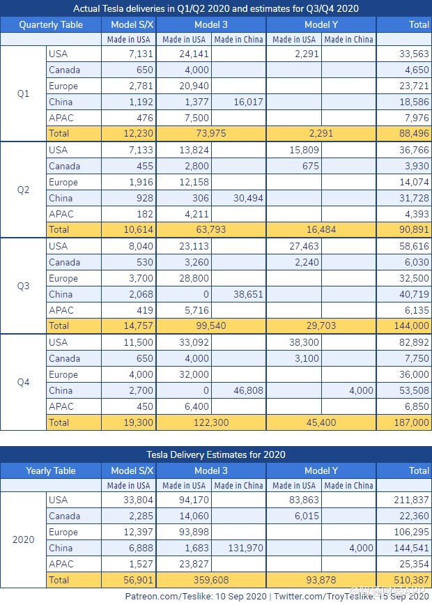 智通财经APP获悉,特斯拉(TSLA.US)忠粉Troy Teslike近期发布对于该公司电动汽车交付量的预估分析。如下图所示,他预计特斯拉第三季度将交付14.4万辆,第四季度交付18.7万辆,2020年共计交付510387辆。