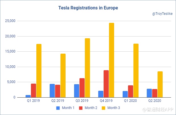 值得注意的是,由于从美国到欧洲的运输时间较长,特斯拉汽车的大多数交付都发生在季度的最后一个月,因此会显示出月度汽车交付量分配不均,如下图所示。