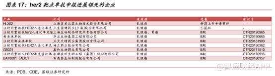 就其已经进入注册申请阶段的HER2来说,目前,国内已上市的抗HER2单抗包括罗氏的曲妥珠单抗(赫赛汀)、帕妥珠单抗(帕捷特)、恩美曲妥珠单抗(赫赛莱,T-DM1),三生国健的伊尼妥单抗(赛普汀)以及复宏汉霖的曲妥珠单抗(HLX02)。