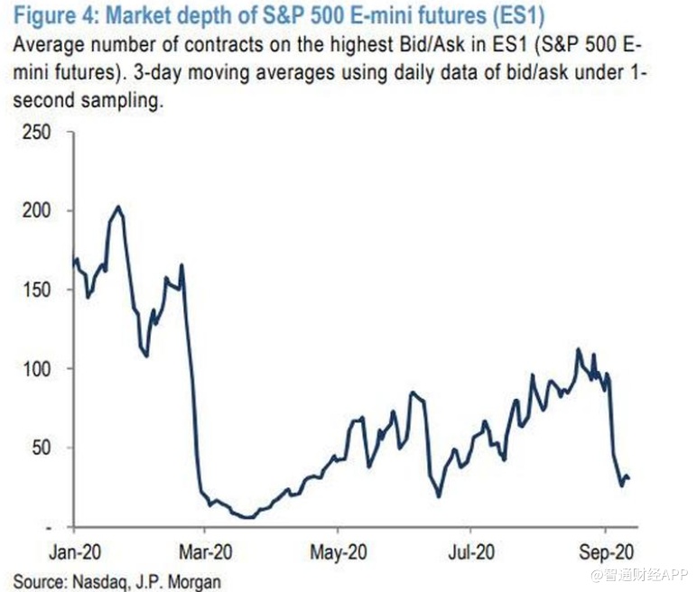 从Emini的买盘/卖盘合约数量的变化中,可以看出市场流动性急剧下降。过去两周,买盘/卖盘合约数量急剧恶化,从8月底的约100份合约,降至目前的仅30份。