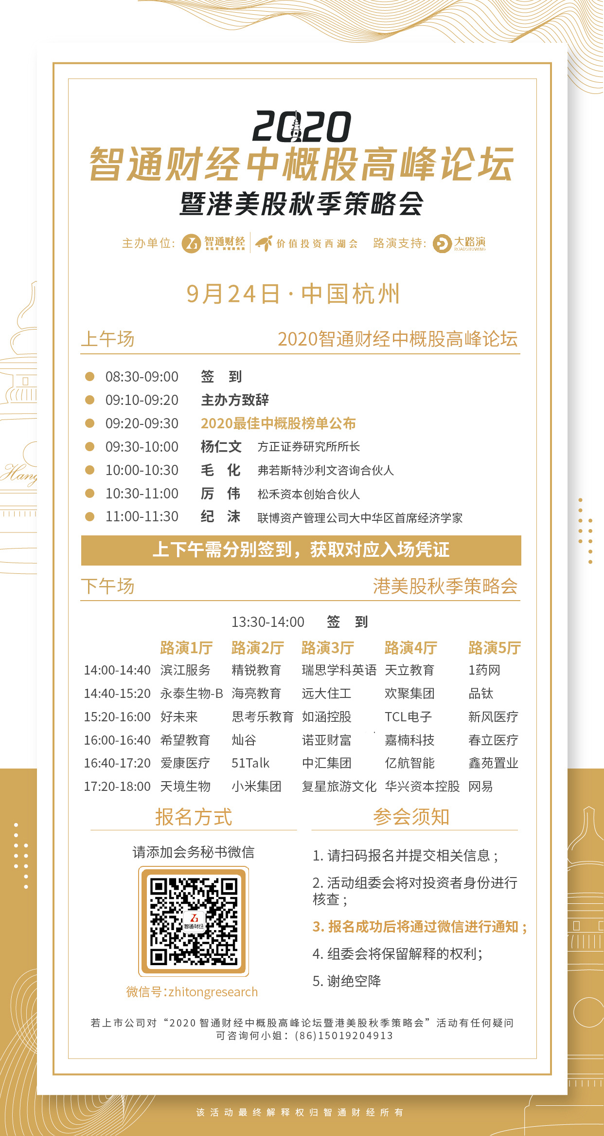 金秋九月,我们齐聚杭州西子湖畔,一同迎接“2020智通财经中概股高峰论坛暨港美股秋季策略会”的隆重启幕。