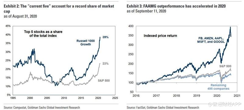 根据高盛的数据,这五家科技巨头分别占标普500指数和罗素1000成长指数的23%和39%,而在最近苹果的市值又超过了整个罗素2000指数。从年初至今的表现来看,FAAMG的年均回报率为40%,而标普的年均回报率仅为5%。