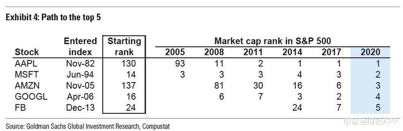 David Kostin指出,当前五家巨头的市场领导地位的路径各不相同。苹果目前是标普500指数中权重最大的股票,市值约为2万亿美元。据悉,苹果在2000年代末经历了非同寻常的增长,在2007年推出iPhone之后,从2005年初标普500指数第93位攀升到2008年的第11位。自2010年以来,该股通过将硬件业务与服务相结合,保持了其优势地位。