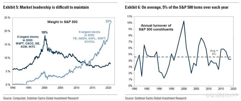 但正如高盛所指出,指数领导地位很难保持,构成指数最高位置的公司名单并非不可改变。表现不佳的公司权重下降,或者可能被完全剔除,取而代之的是较新的、增长较快的成分股。