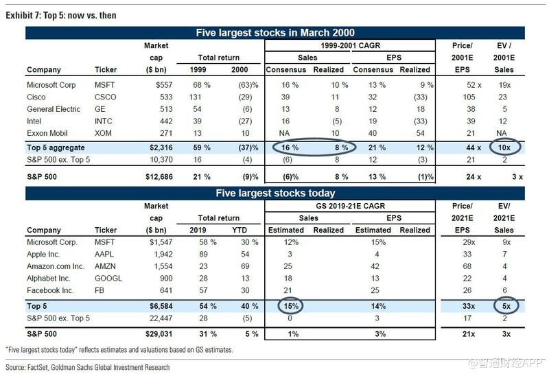 2000年3月,市场预计排在标普500指数最前列的五大股票在1999-2001年销售额CAGR(年复合增长率)和EPS增长率分别为16%和21%,而其2001年的市盈率为44倍,市售率为10倍。然而,实际的销售额CAGR和EPS增长分别只相当于8%和12%。