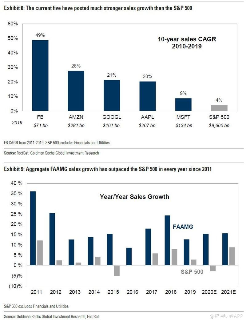 Kostin在阐述他筛选美股未来五强的标准时解释道,当前科技股五强的决定性特征是销售的快速增长。FAAMG在上一个周期的低增长环境中仍能保持高收入增长。