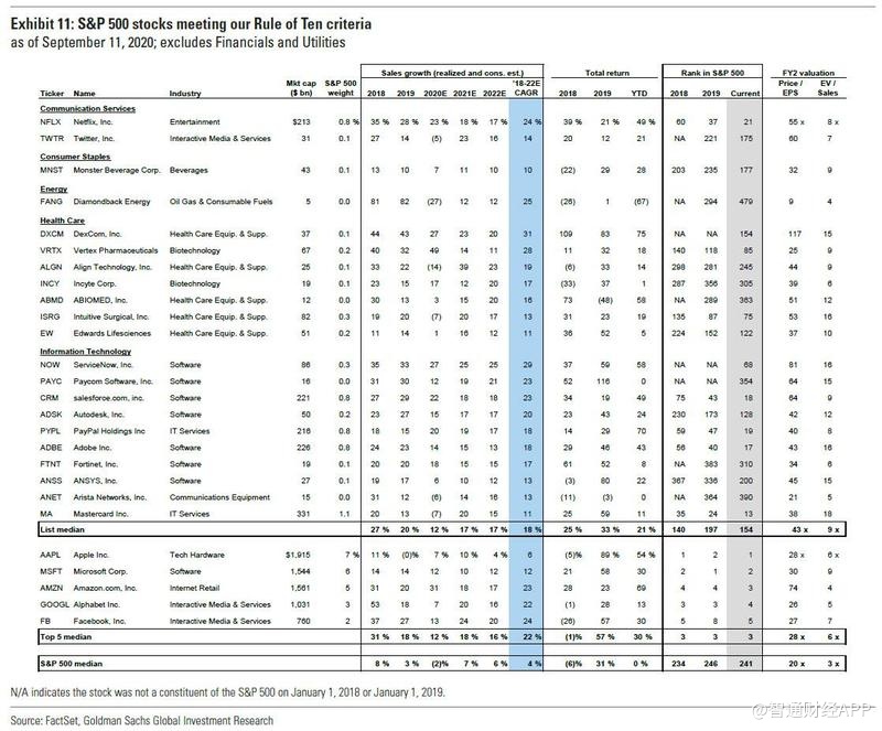 为了识别潜在的美股未来五强,高盛采用“十条规则”以筛选具有强劲销售增长记录和预期收入持续增长的股票。其中两条核心规则为:1.过去两年每年至少实现销售额10%的增长;2.市场普遍预计其未来两年每年销售额至少增长10%。
