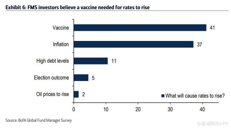 尽管如此,市场观点警告称只有在通缩条件持续将原来的FAAMG推升至历史高位的情况下,这个替代方案才会发挥作用。根据美国银行基金经理的最新调查,卫生事件疫苗、通货膨胀或甚至更高的债务水平将催化利率攀高,而当高利率出现时,大规模超买的科技板块将受到影响,当前的FAAMG和未来五强都将下跌。