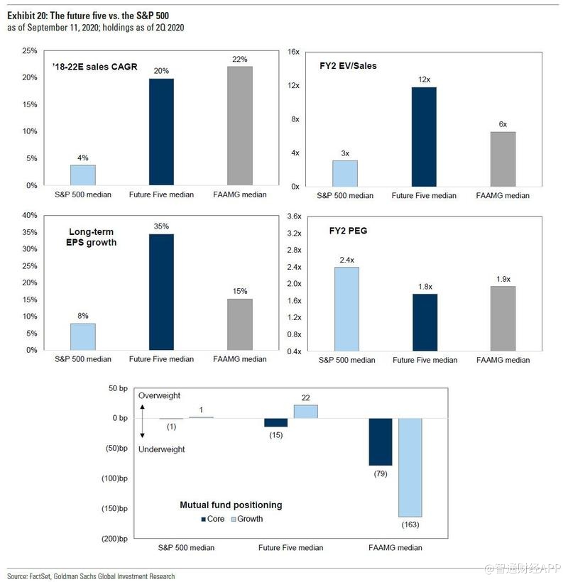 未来五强提供了5倍于标普500指数的销售增长。市场普遍预计,从2018年到2022年,未来五强的平均销售年复合增长率将达到20%,而标普和FAAMG分别为4%和22%。