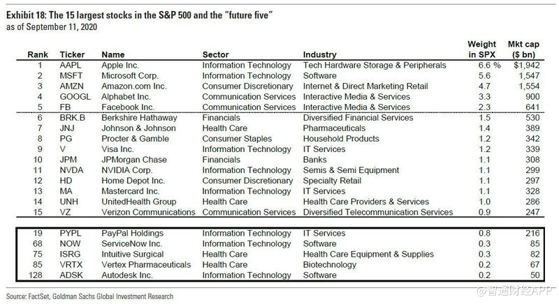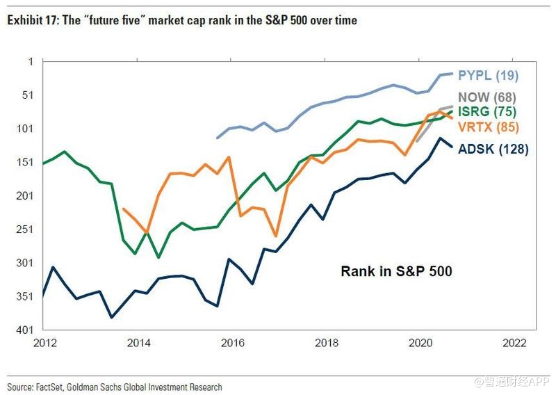 在这五个主题中,高盛强调了潜在的未来五强,即福泰制药、欧特克、PayPal、直觉外科公司和现在服务公司,或简称“VAPIN”。该行股票分析师认为这些股票定位明确,具有引人注目的增长机会。在过去的几年里,这些股票在标准普尔500指数的市值排名中稳步攀升。