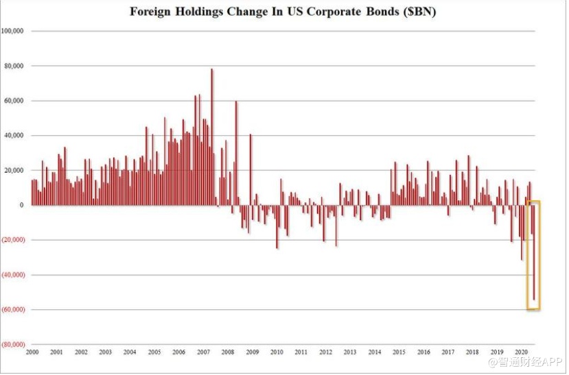 但最令人意外的是外国投资者持有的美国公司债大幅缩水。7月份,外国投资者持有的公司债减少了543亿美元,是有记录以来最大的单月降幅,而6月的降幅较温和,为166亿美元。