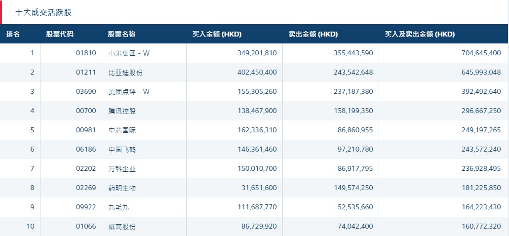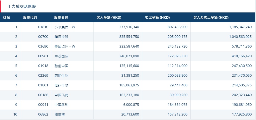 此外,中芯国际(00941)、安踏体育(02020)、九毛九(09922)、融创中国(01918)、威高股份(01066)分别获净买入1.49亿、6309万、5915万、2280万、1268.7万。海底捞(06862)、中国移动(00941)而遭净卖出1.79亿、1.36亿港元。