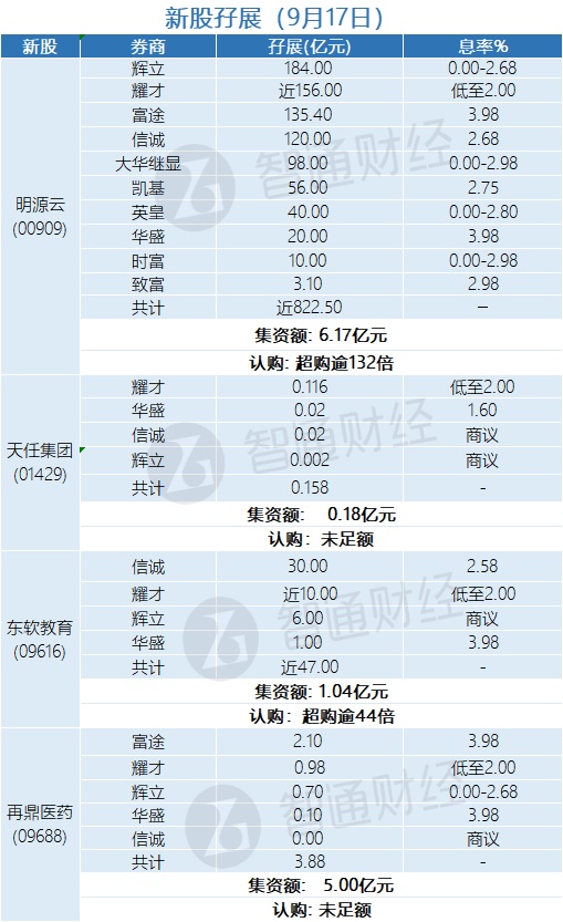 智通财经APP获悉,明源云(00909)、天任集团(01429)、东软教育(09616)、再鼎医药(09688)正在招股中。截至9月17日,辉立 、耀才、信诚等券商合计分别为其借出近822.50港元、0.158亿港元、近47.00亿港元、3.88亿港元。其中,明源云超购逾132倍,天任集团认购未足额,东软教育超购逾44倍,再鼎医药认购未足额。