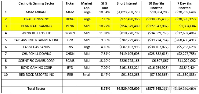 智通财经APP获悉,自公共卫生事件导致旅游和团体活动中断以来,博彩行业的卖空交易一直在增加。目前,美高梅(MGM.US)是该行业空头头寸规模最大的公司,达10.24亿美元,其次是DraftKings(DKNG.US)和佩恩国民博彩(PENN.US),空头头寸分别为9.77亿美元和9.55亿美元。而在今年早些时候,凯撒娱乐(CZR.US)、永利度假村(WYNN.US)和金沙集团(LVS.US)才是空头们最青睐的博彩股。