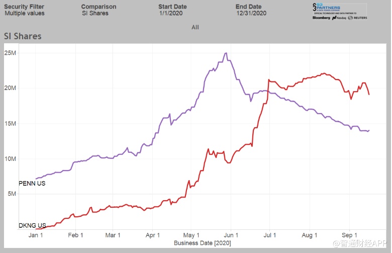 但在2020年上半年卖空交易增加后,空头却开始回补DraftKings和佩恩国民博彩的敞口。7月初,DraftKings的做空交易相对稳定,但空头自8月中旬以来回补了300万股,跌幅为14%,而期间,该公司股价上涨了51%。自5月底以来,佩恩国民博彩的空头一直在减少押注,回补了1100万股股票,跌幅为44%,而该股上涨了115%。