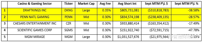 9月,DraftKings和佩恩国民博彩的空头都延续了年初至今的亏损,凯撒娱乐空头回吐了43%年初至今的收益,美彩科技(SGMS.US)的空头收益从获利6900万美元下跌至亏损400万美元。