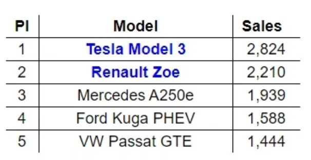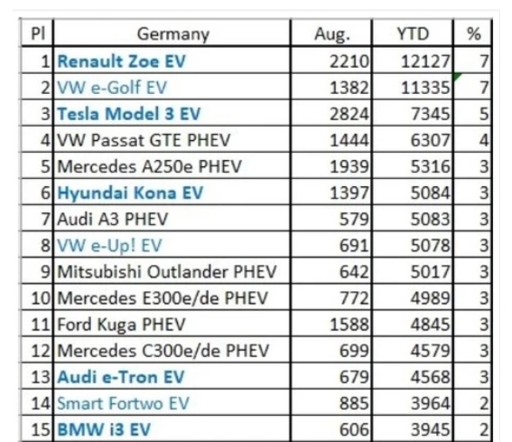 今年8月,特斯拉Model 3型的购买注册量达到了惊人的2824辆,一举成为德国8月份最畅销的电动汽车。紧随其后的竞争对手有雷诺Zoey,销量下降600辆,达到2210辆,位居第二位。奔驰A250e销量1939辆,福特Kuga PHEV销量1588辆,大众帕萨特GTE销量1444辆,分居第3、第4、第5位。