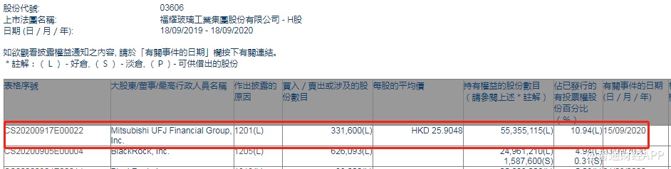 智通财经APP获悉,香港联交所最新资料显示,9月15日,Mitsubishi UFJ Financial Group, Inc.减持福耀玻璃(03606)33.16万股,每股作价25.9048港元,总金额约为859万港元。减持后最新持股数目约为5535.51万股,最新持股比例为10.94%。