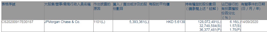 智通财经APP获悉,香港联交所最新资料显示,9月14日,摩根大通增持中国铁建(01186)约539.34万股,每股作价5.6138港元,总金额约为3027.72万港元。增持后最新持股数目约为1.28亿股,最新持股比例为6.16%。