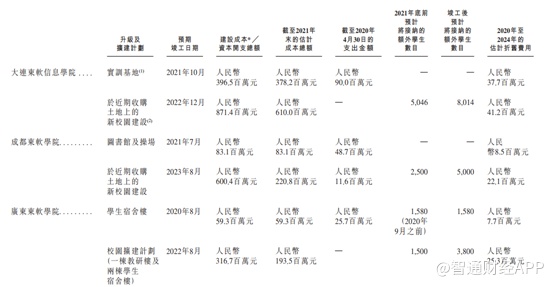 因此,公司在招股书中表示融资一部分的资金用于升级扩建,预期在2021至2023年先后完成竣工。扩建计划完成后,大连东软信息学院、成都东软学院及广东东软学院预计将分别额外容纳8014名、5000名及5380名学生,与2019/2020学年相比,学校容量将分别增加47.6%、46.0%及51.6%。