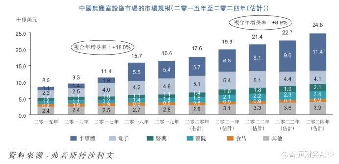 据弗若斯特沙利文预计,2015-2019年间,中国无尘室设施市场规模由85亿美元增至166亿美元,复合年增长率为18.0%。其中,半导体及显示器分部贡献总市场增长的最大部分。