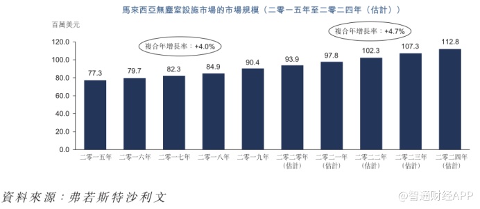 与此同时,弗若斯特沙利文认为,马来西亚无尘室设施市场市场规模于2015-2019年间实现4%复合年增长至904万美元。其中,公共卫生事件对市场造成的长期影响有限,预计2020-2024年市场规模将以4.7%复合年增长率发展至1128万美元,主要由医药、医院、医疗设施行业的增长以及半导体加工与包装及组装行业的增长所带动。