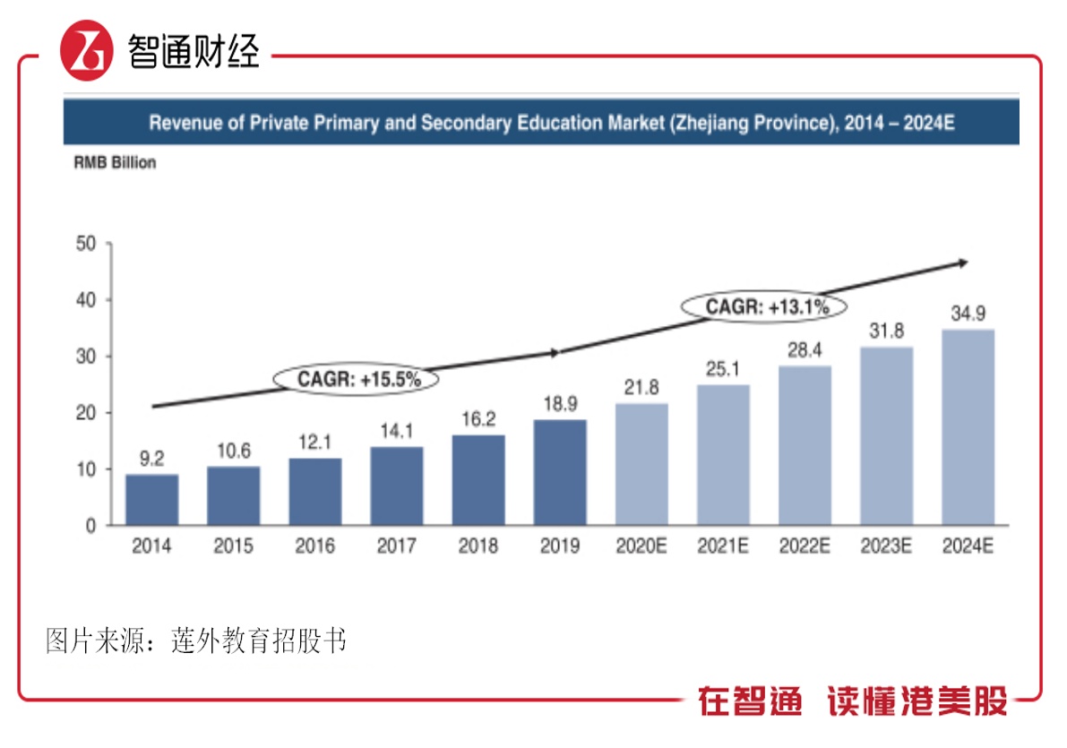 根据招股书,该公司的白云校区和怡景校区定位高端,2019/2020学年,白云校区平均每名学生学费13000元,相比于2017/2018学年增长了22.64%,怡景校区自2018年9月1日起,每学期学费一直保持在每名学生20000元,高于白云校区的学费。而2019年浙江省民办小学和中学的平均年学费分别为人民币10900元和18300元。