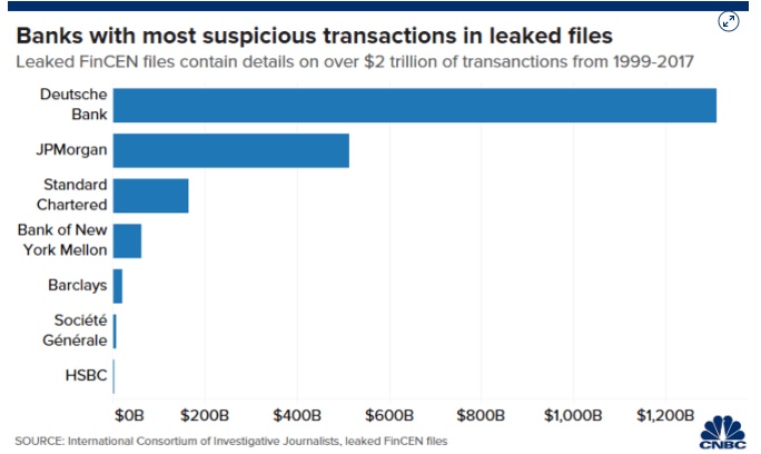 智通财经APP获悉,据外媒报道,近日美国政府“意外”泄漏了一份关于全球银行可疑交易情况的报告。报告显示,在1999年至2017年期间,在被美国政府标记为可疑的2万亿美元交易中,有1.3万亿美元与德意志银行(DB.US)有关。