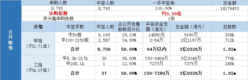 其中,公开配售申购人数8793人,一手中签率100%,认购倍数3.39倍。
