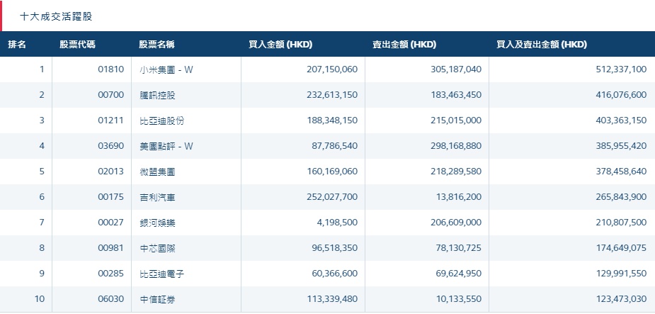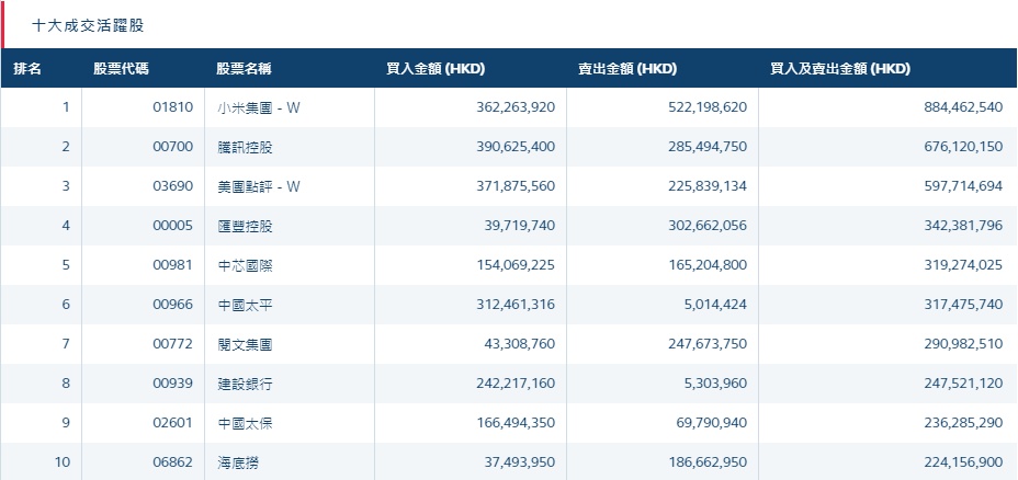 此外,建设银行(00939)、腾讯(00700)、中芯国际(00981)分别获净买入2.36亿、1.54亿、725万港元。而比亚迪电子(00285)遭净卖出925万港元。
