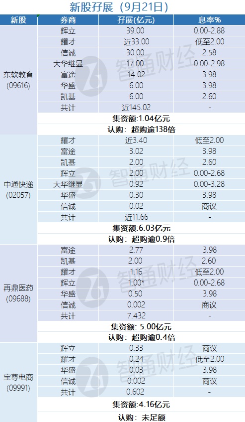 智通财经APP获悉,东软教育(09616)、中通快递(02057)、再鼎医药(09688)、宝尊电商(09991)正在招股中。截至9月21日,辉立 、耀才、信诚等券商合计分别为其借出近145.02亿港元、近11.66亿港元、7.432亿港元、0.602亿港元。其中,东软教育超购逾138倍,中通快递超购逾0.9倍,再鼎医药超购逾0.4倍。
