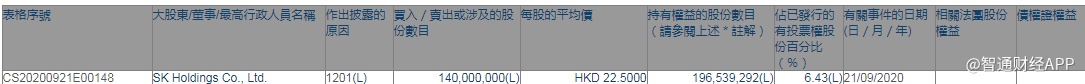 智通财经APP获悉,香港联交所最新资料显示,9月21日,SK Holdings Co.,