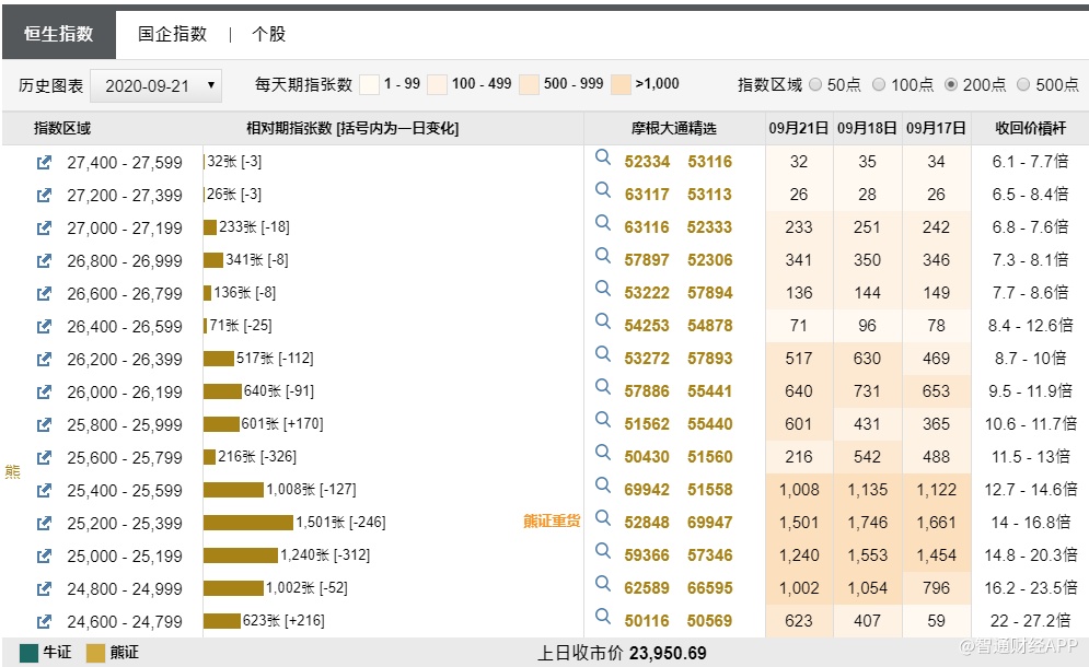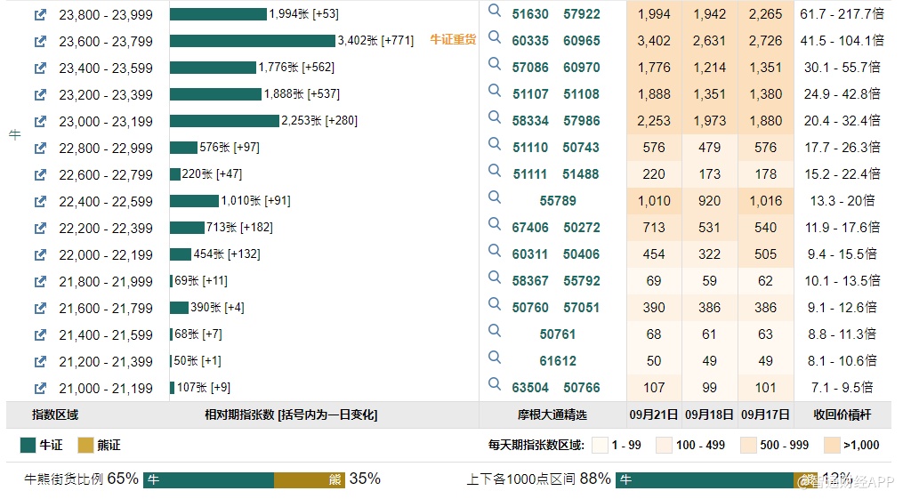 智通财经APP获悉,截至9月21日,恒指最新的牛熊街货比例65:35。摩根恒指牛熊证街货分布图中的数据显示,熊证街货重货区25200-25399区间,该区间最新熊证数量为1501张;最多新增在25800-25999区间,较上一交易日增加170张。牛证街货重货区在23600-23799区间,该区间最新牛证数量为3402张,较上一交易日增加771张,最多新增也在该区间。