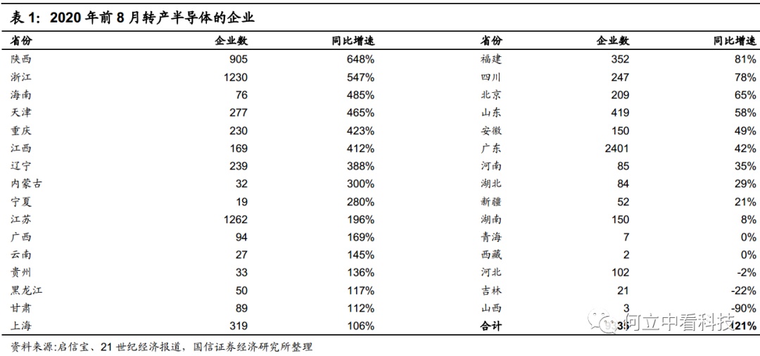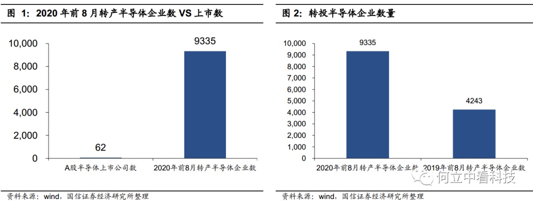 2020年前8个月中国有近万家(9335家)企业转投芯片行业,同比增长1.2倍。A股半导体上市公司目前62家,新转型做半导体的企业数量是存量的150倍。