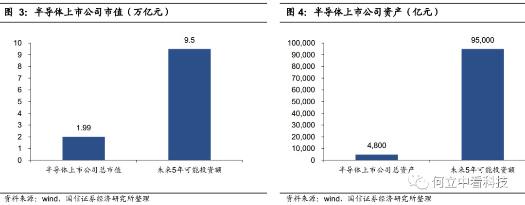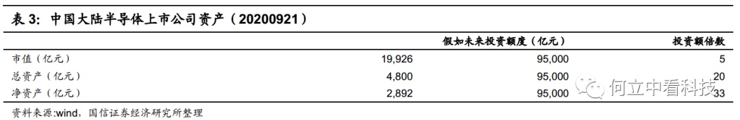 由于中国大陆主流半导体公司已经上市,半导体上市公司的可以代表中国大陆全部半导体公司资产。假如未来投资9.5万亿元,相当于将现有半导体资产规模扩大20倍。