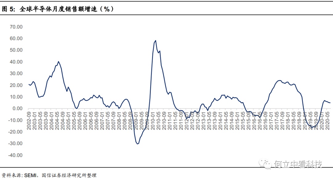 2020年前7个月全球半导体销售额增速分别为-0.3%、5%、6.9%、6.1%、5.8%、5.1%、4.9%。