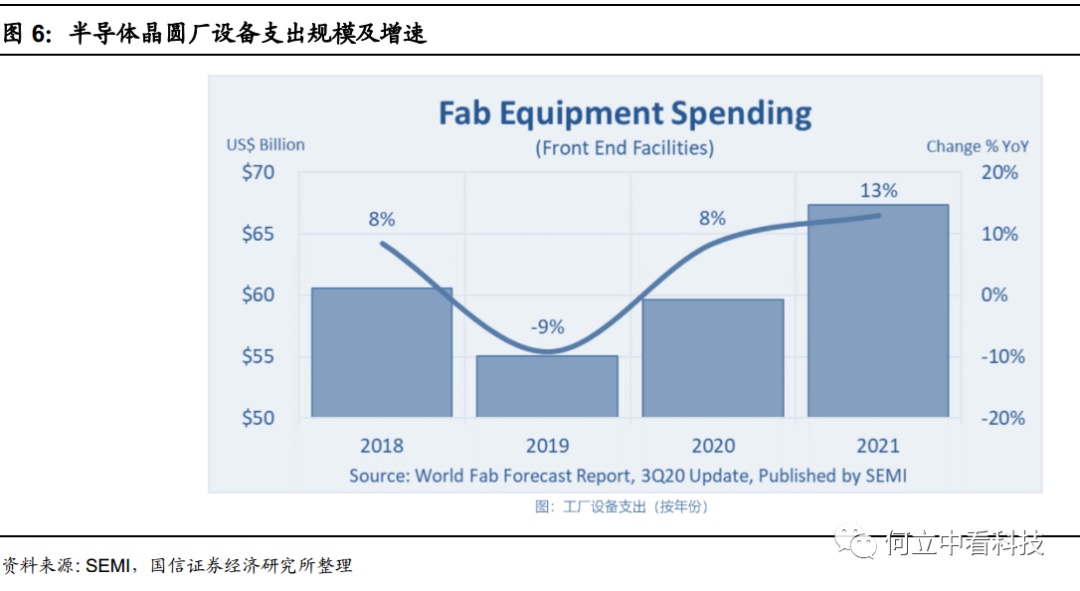 另外,根据国际半导体产业协会(SEMI)对全球半导体设备市场预测,受益于通信、IT基础设施到个人与云端运算、游戏和医疗电子装备等各种产品的推动,全球芯片需求在公共卫生事件影响下持续激增,晶圆厂设备支出因此受益,2020年增幅预估达8%,2021年将增长至13%。随着中美贸易紧张局势加剧,数据中心基础设施和服务器存储需求不断增加,供应链预留安全库存,也为今年的增长做出了贡献。