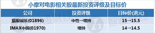 该行认为,国庆黄金周票房势头表现可能较为强劲,因此将猫眼娱乐(01896)评级由“中性”上调至“增持”,目标价由15港元上调至15.5港元,IMAX中国(01970)目标价由14港元上调至14.5港元,评级为“增持”。