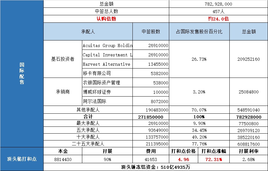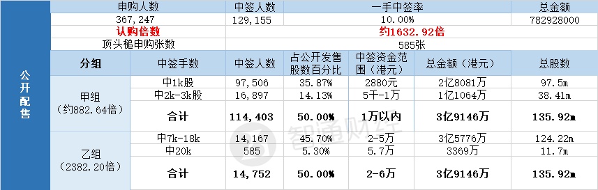 其中,公开配售申购人数367247人,一手中签率10%,认购倍数约1632.92倍。