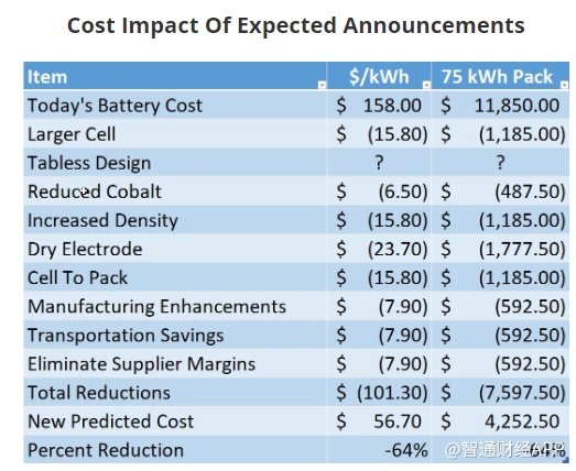 Paul预计,电池日公布的技术有望将电池的成本降低64%。