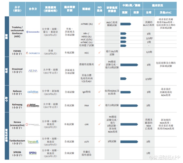 从云顶新耀的研发管线来看,公司所有引进的管线都是FIC和BIC类产品,对应的肿瘤、免疫、心肾以及感染性疾病四个领域,公司都已有相应的核心产品,分别为sacituzumab govitecan、etrasimod、Nefecon以及eravacycline。