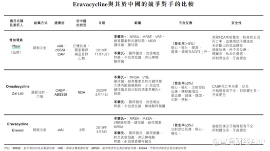 最后,感染性疾病的eravacycline(Xerava)是一种潜在同类最佳新型全合成非消化道给药的四环素类药物,和中国的竞争对手相比,这款药的不良反应率更低,安全性更高。