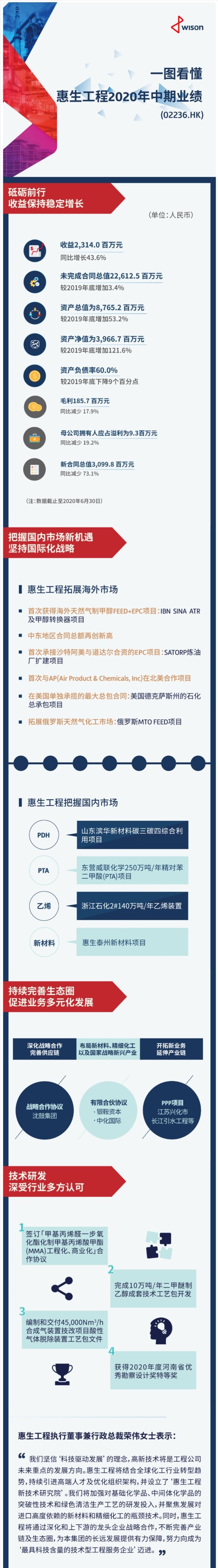 智通财经获悉,9月22日,据港交所官网披露,中国领先的化工工程设计、采购及施工(EPC)总承包服务和技术整合解决方案供应商惠生工程(02236)发布了2020年中期业绩报告概览。截至2020年6月30日止六个月(简称“回顾期”),惠生工程录得收益约人民币23.14亿元,同比增长43.6%。