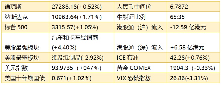 1、 隔夜美股标普500指数涨34.5点,涨幅1.05%,报3315.57点;纳斯达克指数涨184.8点,涨幅1.71%,报10963.64点;道琼斯指数涨140.5点,涨幅0.52%,报27288.18点。港股ADR指数小幅下跌,按比例计算,收报23697点,跌19.42点或0.08%。