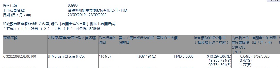 智通财经APP获悉,香港联交所最新资料显示,9月18日,摩根大通增持洛阳钼业(03993)198.7191万股,每股作价3.0663港元,总金额约为609.33万港元。增持后最新持股数目约为3.16亿股,最新持股比例为8.04%。