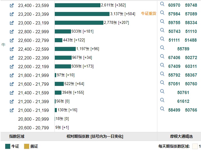 智通财经APP获悉,截至9月23日,恒指最新的牛熊街货比例65:35。摩根恒指牛熊证街货分布图中的数据显示,熊证街货重货区在24700-24899区间,该区间最新熊证数量为1443张;最多新增在24300-24499区间,较上一交易日增加563张。牛证街货重货区在23200-23399区间,该区间最新牛证数量为3137张,较上一交易日增加504张,最多新增也在该区域。