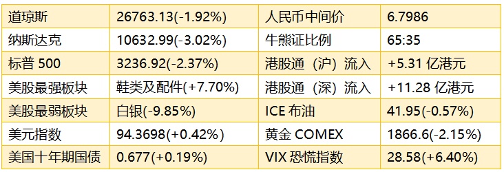 1、 周三,英国宣布重启防疫限制措施后,美国总统特朗普强调不会跟从,大型科技股受压,拖累美股表现。隔夜美股截至收盘,标普500指数跌78.70点,跌幅2.37%,报3236.92点;纳斯达克指数跌330.70点,跌幅3.02%,报10632.99点;道琼斯指数跌525.00点,跌幅1.92%,报26763.13点。港股ADR指数跟随大幅下跌,按比例计算,收报23496点,跌245.81点或1.05%。