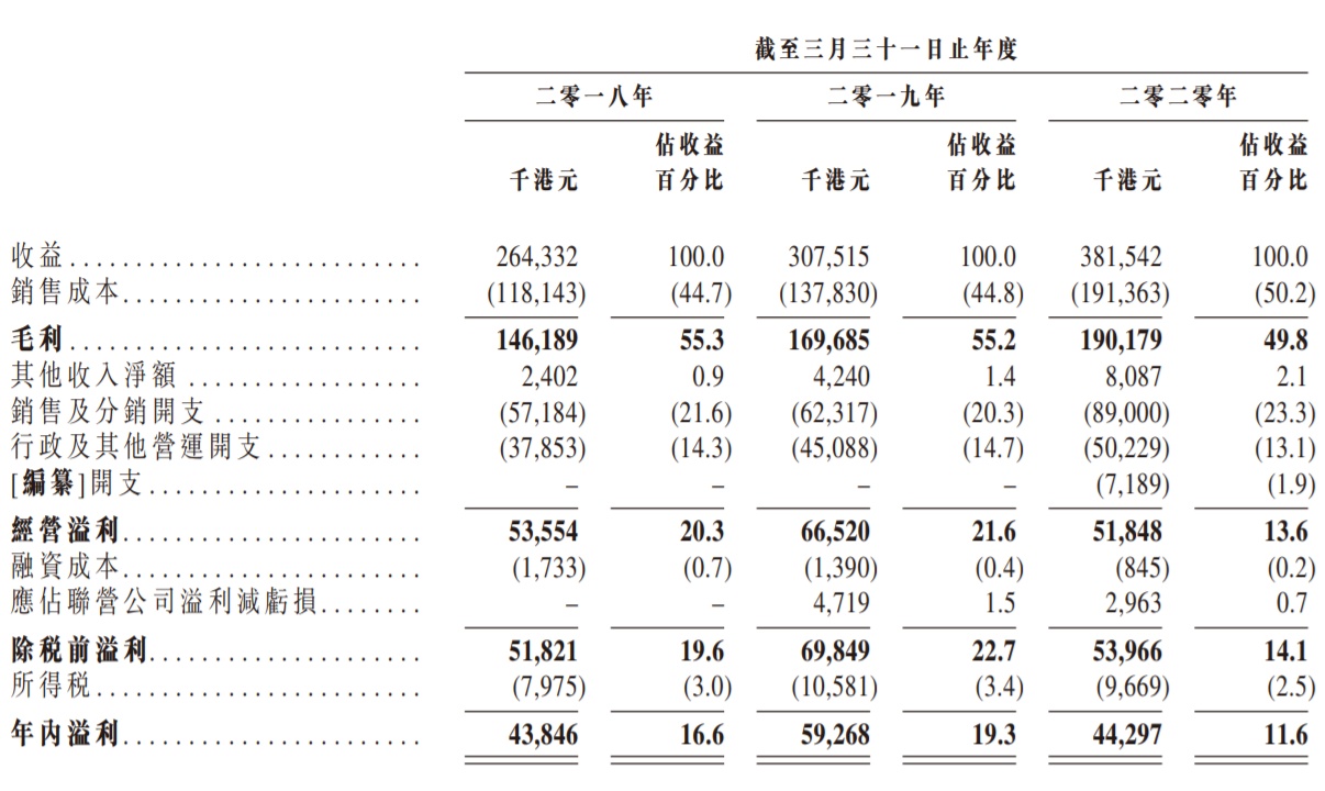 截至2018年-2020年3月31日止年度,公司收入分别约为2.64亿港元、3.08亿港元、3.82亿港元;年内利润分别为4384.6万港元、5926.8万港元、4429.7万港元。