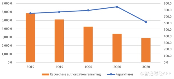 截至第三季度,Adobe已经撤回了回购股票的计划,理由是目前的不确定性,但它仍在本季度以6.17亿美元回购了150万股股票。这意味着,80亿美元的回购授权中有29亿美元左右,将持续到21财年。